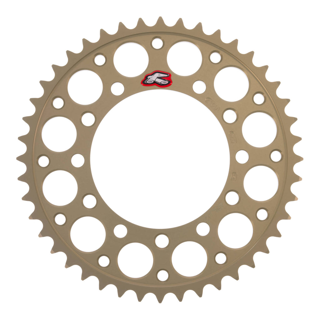 Renthal hard anodised rear sprockets are precision CNC manufactured to extremely high tolerances. The high strength is especially enhanced by using a 7075 T6 aluminium alloy coated in an ultra-hardwearing finish for extreme mileage. The rear sprockets computer-aided design gives the maximum reduction of unsprung weight at the rear wheel, to give maximum power transfer. The Renthal rear sprockets are 33% lighter than steel and the self-cleaning mud grooves prevent dirt buildup and help keep the sprocket clean.